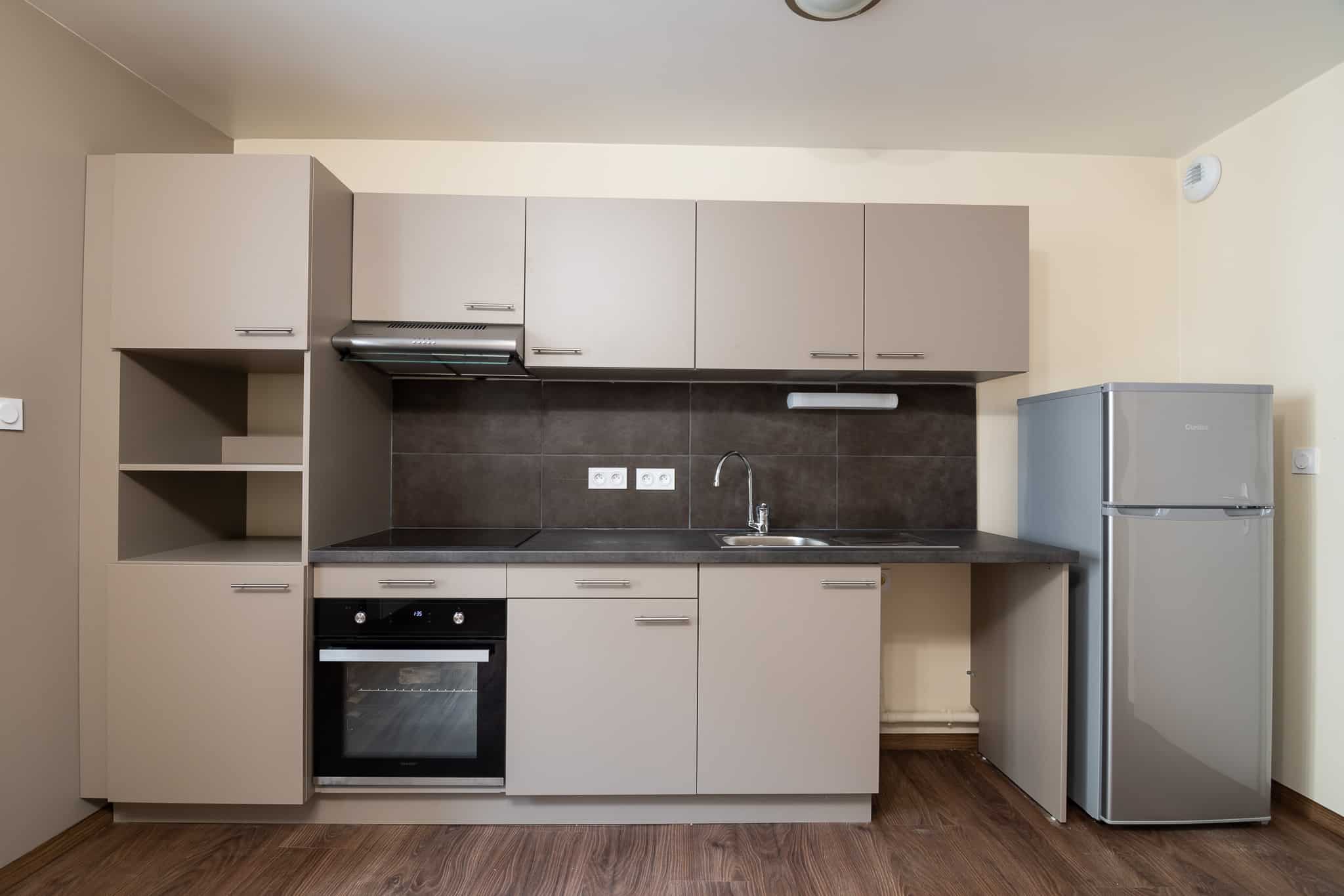 - Cuisine équipée d’une plaque de cuisson induction avec hotte, d’un four et d’un réfrigérateur/congélateur.