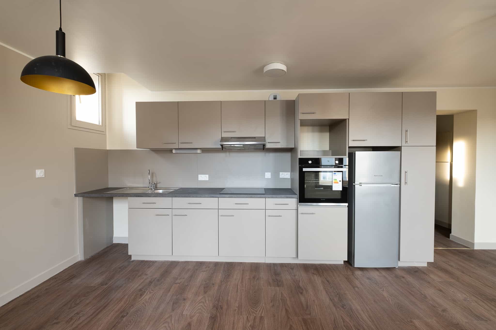 - Cuisine équipée d’une plaque de cuisson induction avec hotte, d’un four et d’un frigo neufs.