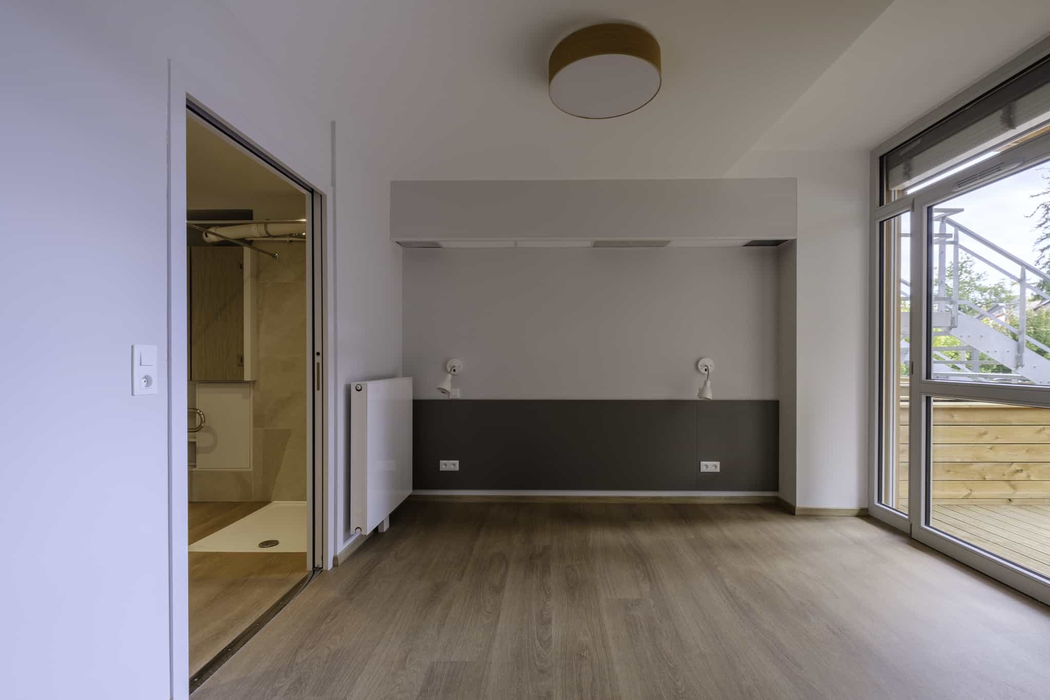 Accessible PMR, ce T3 bénéficie d’une luminosité naturelle exceptionnelle grâce à ses grandes ouvertures. Il se compose de 2 chambres, de 2 salles d’eau (douches/baignoire) et la cuisine, ouverte sur une vaste pièce de vie, est toute équipée. L’appartement dispose de nombreuses solutions de rangement (dressings, placards etc.) et vous serez séduits par sa grande terrasse avec vue sur un petit jardin commun à la résidence.